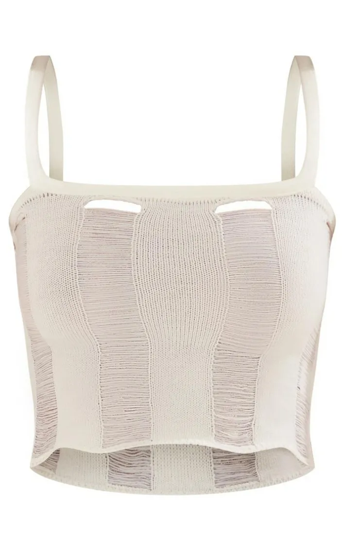 Switch up your wardrobe with this cream laddering knit crop top. This crop top is sure to steal all the stares with its laddering design whilst its cream knit material brings all the cosy feels to both an everyday and weekend look. It has a square neck and copped length which is seriously flattering for your figure. Pair with statement jeans, metallic heels, and a sporty jacket for a vibe that won’t go unnoticed.