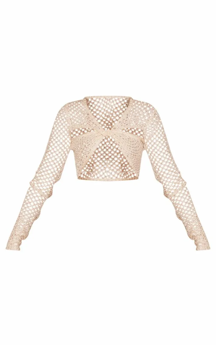 Take your new season wardrobe that extra mile with this cream open crochet sequin knit crop top. This crop top is brought to you in a cream open crochet knit material with sequin detailing and a cropped length, what’s not to love? Pair this crop top with hot pants and cowboy boots for a look that will have all eyes on you.