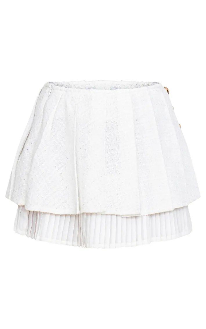 Look the best dressed for any occasion with this cream pleated textured boucle mini skirt. Brought to you in a cream textured boucle material with a mini length, you are sure to stand out. This mini skirt pairs perfectly with a cropped shirt and heels of your choice for a combo we are loving.