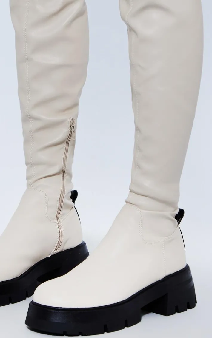Get ready to make a statement in these unreal boots. Featuring a cream hue PU material with an over the knee design and a chunky arched sole, what more could you want?