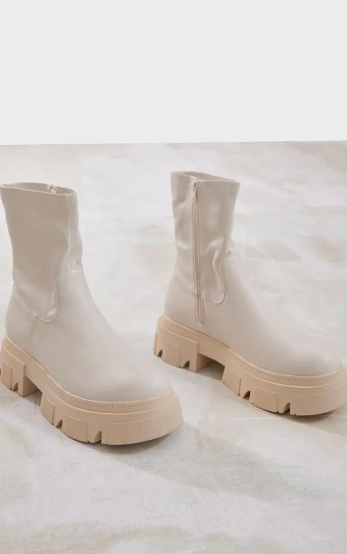 Get ready for the new season with these boots. Featuring a cream PU textured material with an extreme cleated dole with a sock style, what’s not to love?