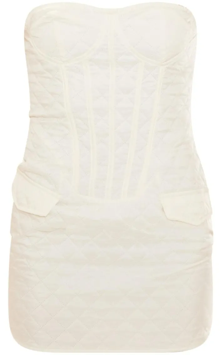 Get ready to take the stress out of weekend styling with this cream quilted underwired pocket detail bandeau bodycon dress. Brought to you in a cream hue quilted material with a figure-flattering underwired design, pocket detailing and a bandeau neckline, what more could you want? Style this bodycon dress with heeled mules and gold accessories for an effortlessly chic look worthy of your weekend plans.