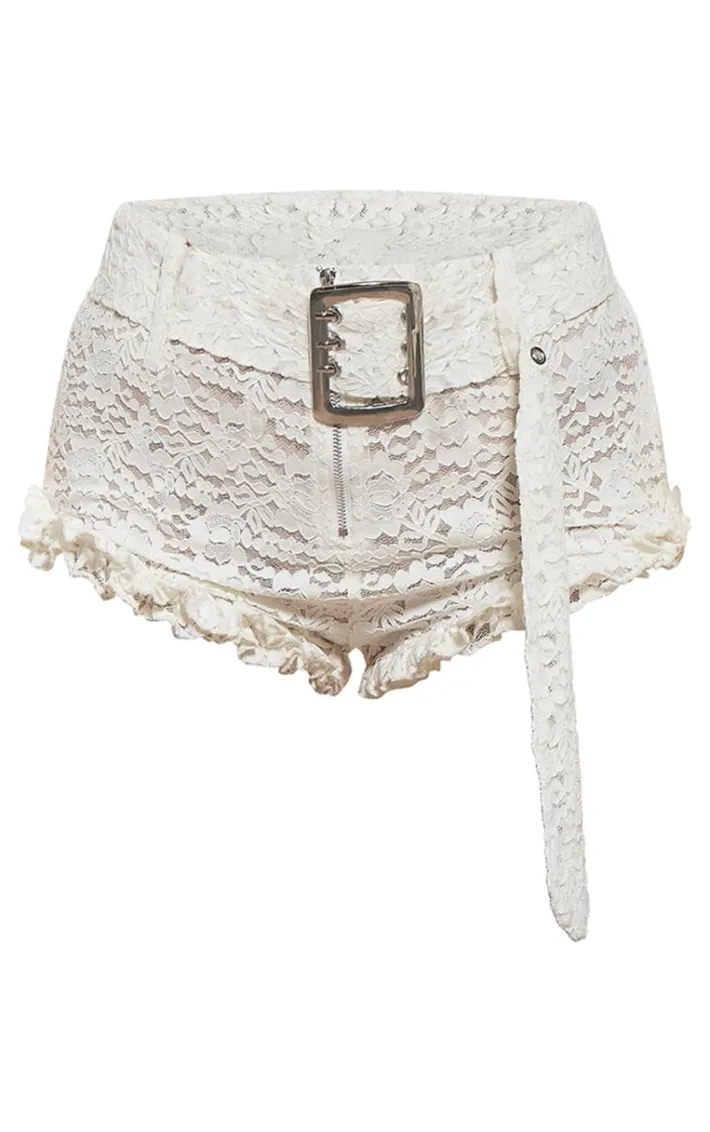 Bring all the luxe lace feels to your look with these cream sheer broderie lace belted hot pants. Brought to you in a cream hue sheer broderie material with lace detailing and a figure-flattering fit, you really can’t go wrong. Pair these hot pants effortlessly with the matching top, boots and statement gold accessories for a look that will have all eyes on you.