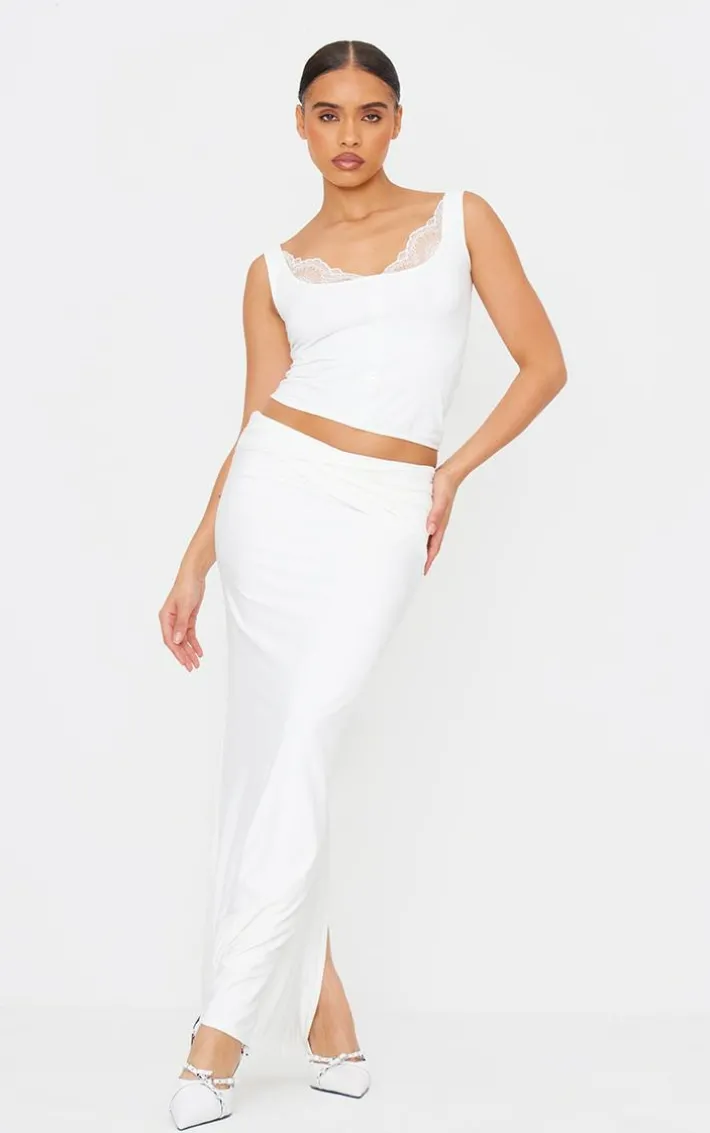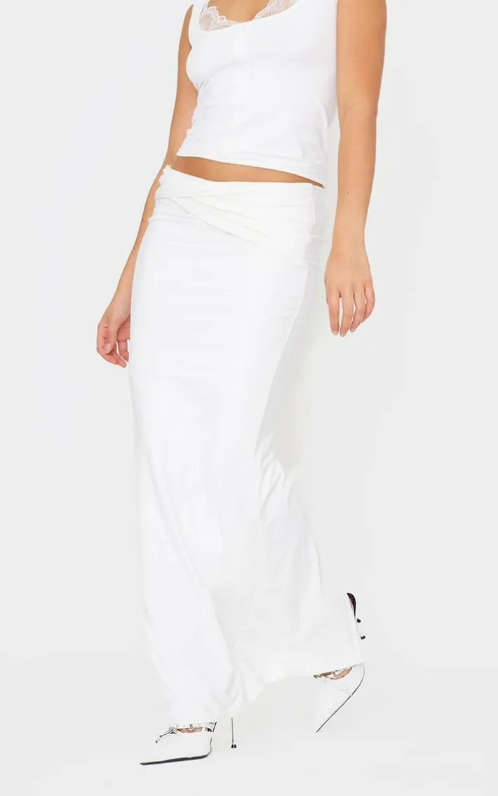 Introducing you to this cream slinky double layer jersey twisted waist detail maxi skirt to your new style staple. Brought to you in a cream slinky material with a double layer design and a twisted waist detail, giving you a flattering fit like no other. Team this maxi skirt with the matching top and a pair of court heels to finish off the look we are loving.