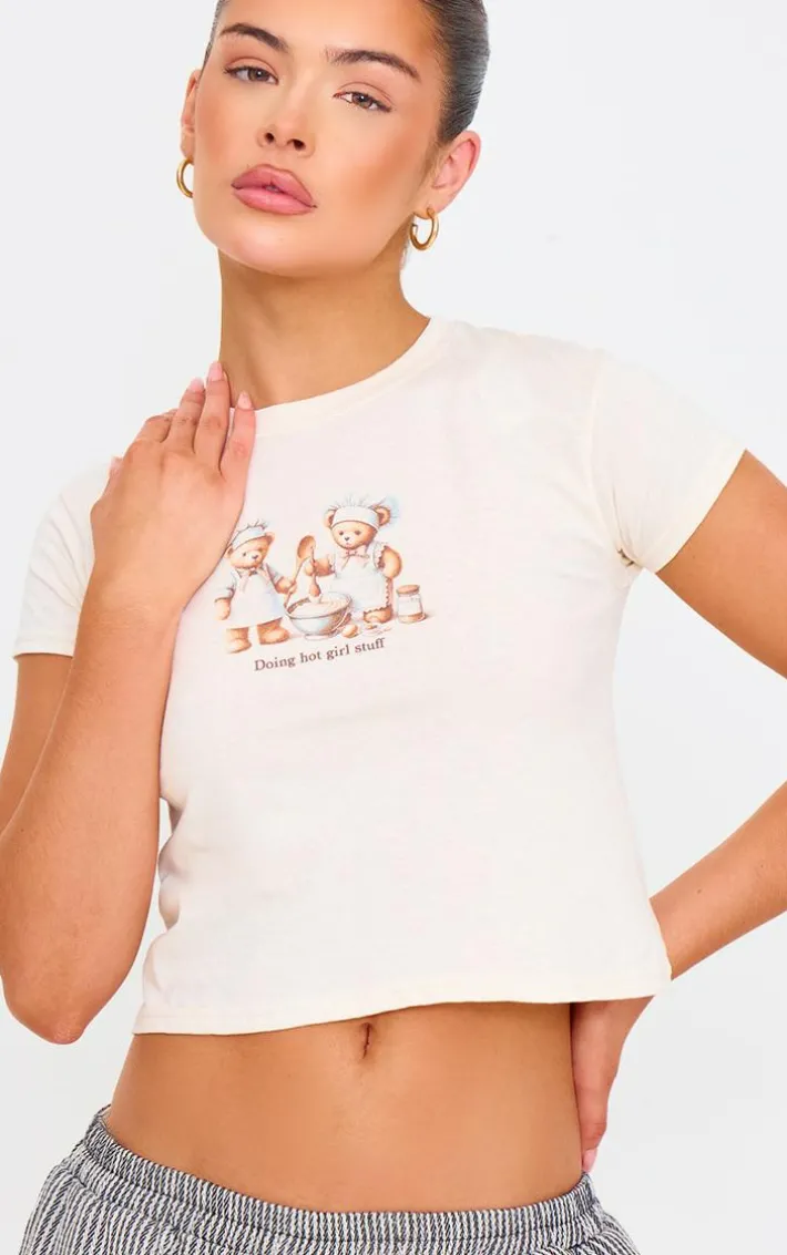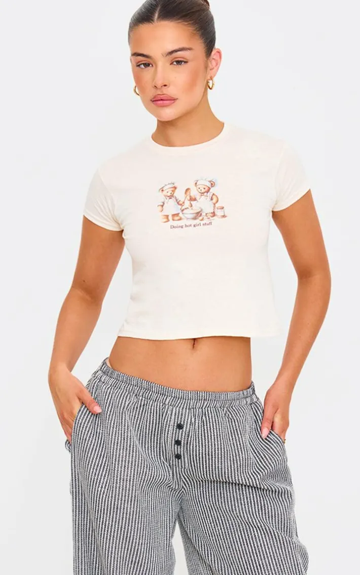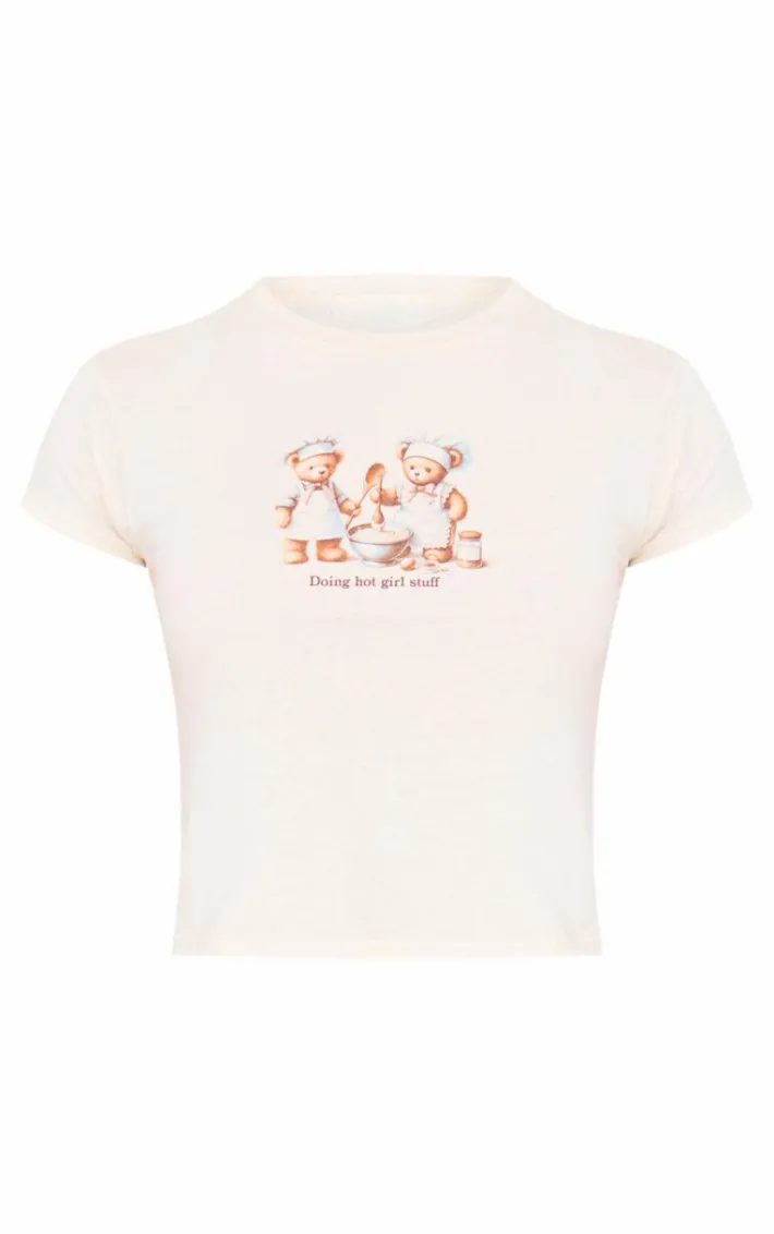 Elevate your basics collection with this cream teddy bear baking baby doll. With its versatile cream shade and bears baking Graphic, you’ll be reaching for this again and again. Simply team with a pair of pinstripe linen pants and white sneakers for a style we can’t get enough of.