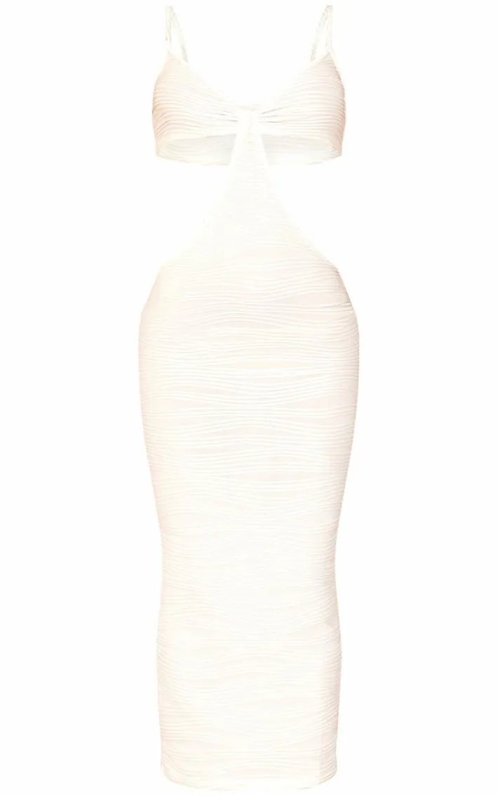 Steal all the stares in this cream textured cut out knot detail strappy midaxi dress. Brought to you in a cream textured material with a cut out design and knot detail, this strappy midaxi dress is a must have. Style with gold heels and accessories for all the vacay vibes.