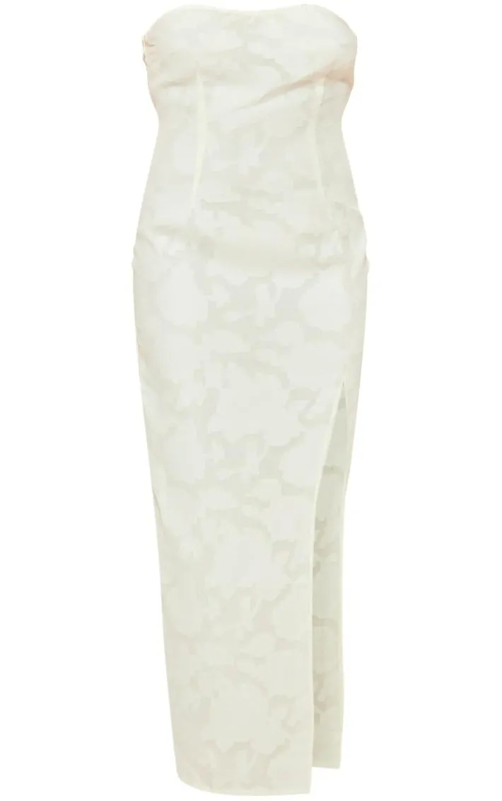 Introducing the ultimate dreamy ‘fit for your weekend plans with this cream textured floral bandeau maxi dress. Its cream textured floral material adds all the glam vibes to your look whilst its split hem and bandeau neckline will give you that seriously chic look that won’t go unnoticed. This maxi dress is sure to tick all the boxes and nail the dress code for your special occasion. Simply add clear heels, gold accessories and a mini bag for a flawless finish.