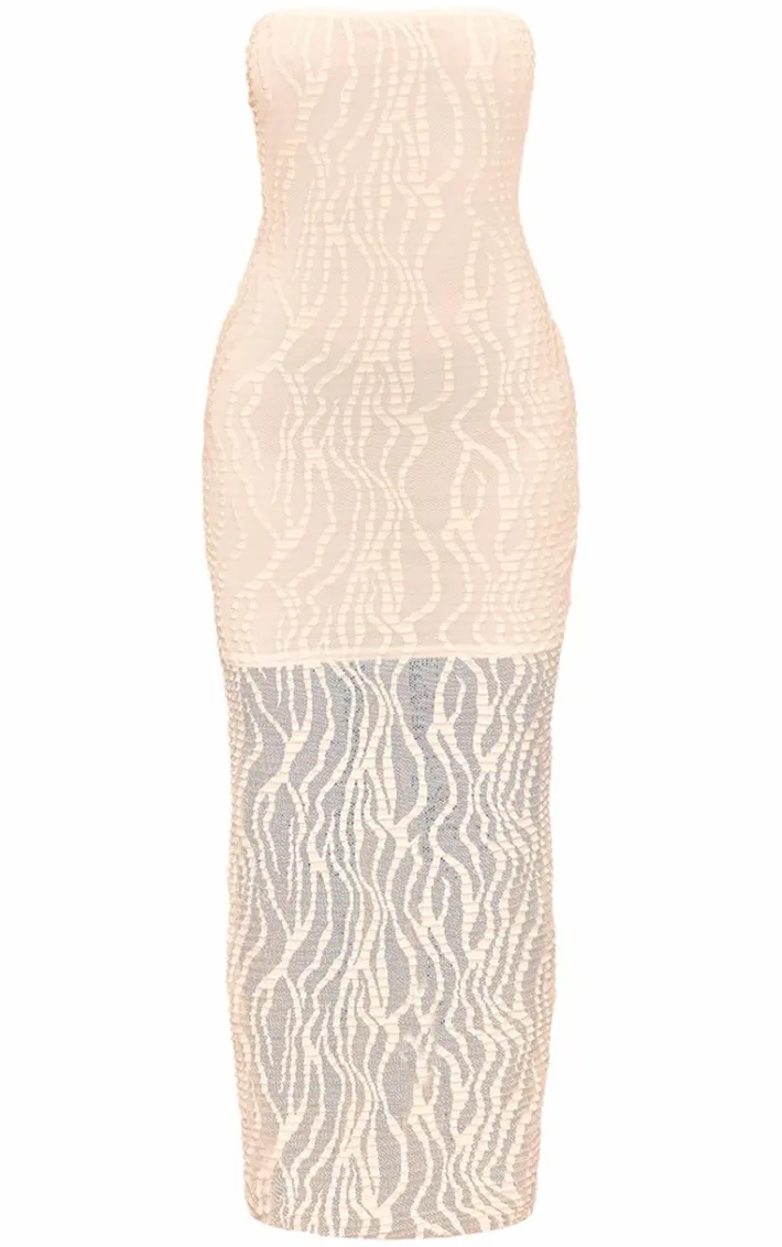 Found some last-minute weekend plans and need an unreal ‘fit? Then we have you covered with this styling staple, a cream textured sheer jersey bandeau maxi dress. Made from a cream textured sheer material with a bandeau design and a maxi length, we’re obsessed. Work your styling techniques and add high heels and your statement accessories for a weekend-worthy finish that will gain all the likes.