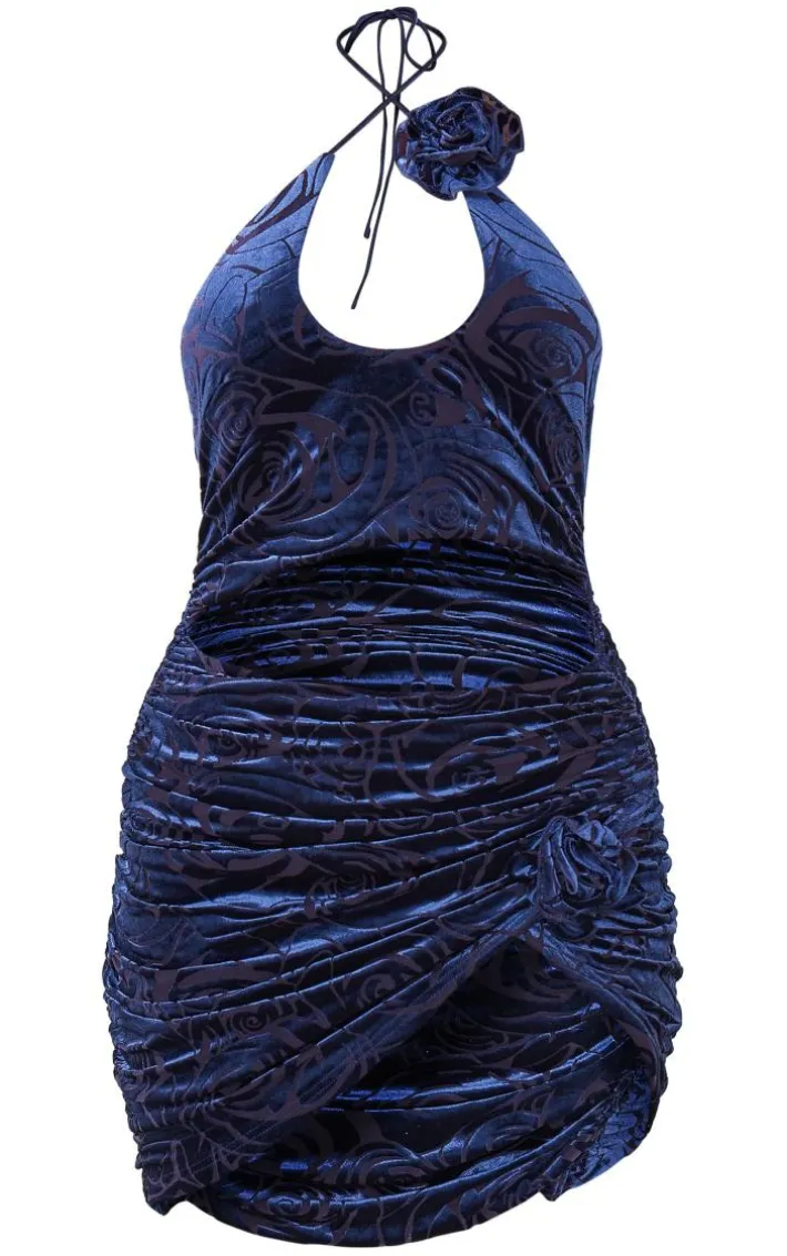 Channel all the chic vibes into your weekend wardrobe with this dark blue printed devore rose applique cut out ruched mini dress. Made from a dark blue printed devore material with a rose applique detail and a cut-out design, this bodycon dress definitely ticks all the boxes. If you’re looking for a dress that gives you a super flattering fit, then this mini dress is calling your name. Team with clear heels, gold accessories and a mini bag ready for a night.