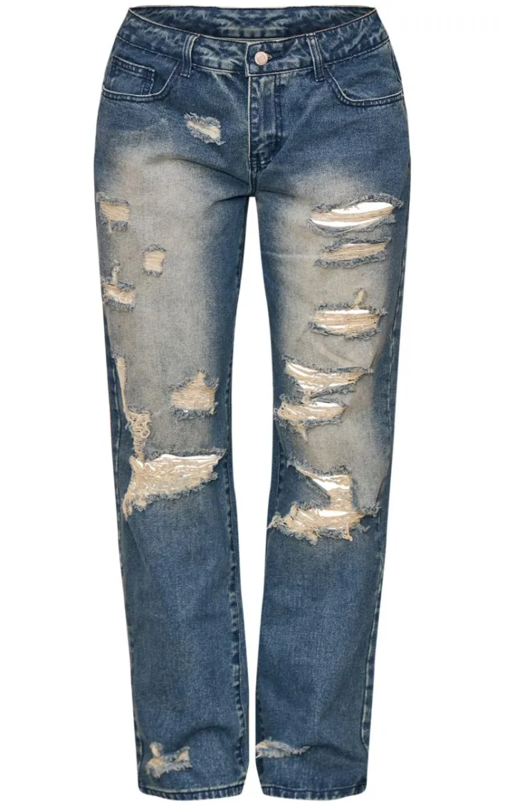 Make room in your wardrobe for these dark blue wash extreme distressed wide leg jeans. They’re made using a dark blue wash material with extreme distressed detailing and a wide leg design, what more could you want? Style these distressed jeans effortlessly with a basic top, sneakers and your go to accessories for a look everyone will want.