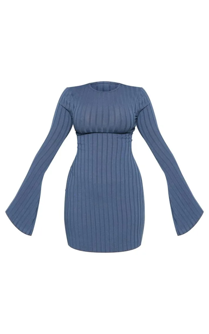 This dark blue wide rib flare lettuce hem sleeve bodycon dress is sure to be a staple in your new season wardrobe. Perfect for AM to PM styling, you really can’t go wrong. This bodycon dress is made from a dark blue wide rib material with long flared sleeves and lettuce hem detailing. Style with knee length boots and gold accessories for a look that can be dressed up or down to suit your plans.