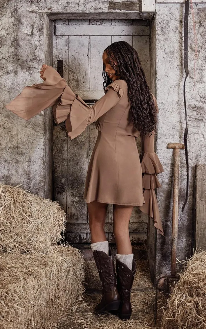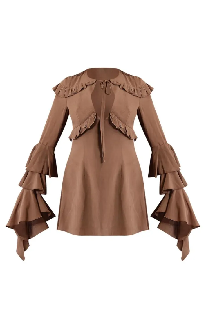 Take on your weekend the right way with this statement dark brown chiffon ruffle detail long sleeve a-line shift dress. Made from a dark brown chiffon material with a ruffle detail and a long sleeve fit, this is everything we’re loving and more. This a-line shift dress is sure to hug you in all the right places. To complete the look style this seamlessly with your fave accessories and some knee high chunky boots for a look that will secure you all the likes.