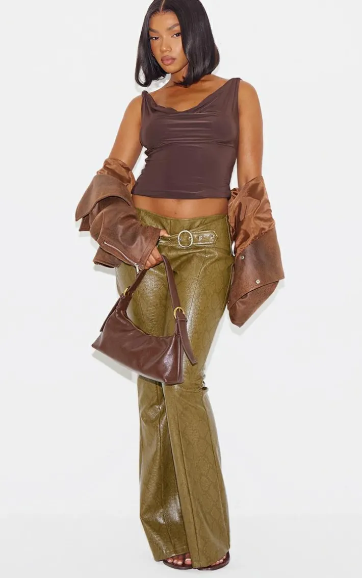 Get ready to have all eyes on you with these dark khaki snake print faux leather low rise pants. These pants are brought to you in a dark khaki snake print faux leather material with a low rise fit and a flared style, what more could you ask for? Wear with a white crop top your dreamy high heels and accessories for a look that we can’t stop crushing on this season.