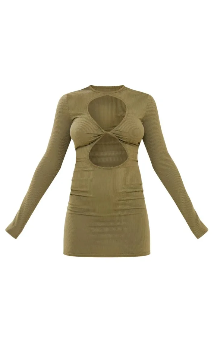 Be on trend this season with this dark olive rib long sleeve twist front cut out mini dress. Brought to you in a dark olive ribbed material with long sleeves, a twist front and a cut-out design and a mini length, how could you say no? This mini dress is perfect for those on the go days. Team with clear high heels and accessories to be the center of attention wherever you step foot this season.