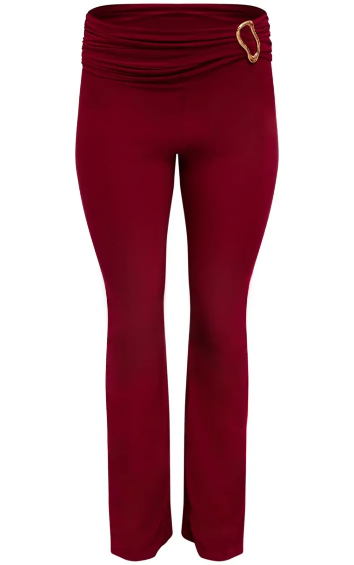 Steal all the stares in these dark red slinky fold over metal trim skinny flare pants. Brought to you in a dark red hue slinky material with a fold over waistband detail and metal trim design, thee skinny flare pants are calling your name. Style with the matching top, chunky gold jewelry and your fave heels for a figure-hugging combo we can’t get enough of.