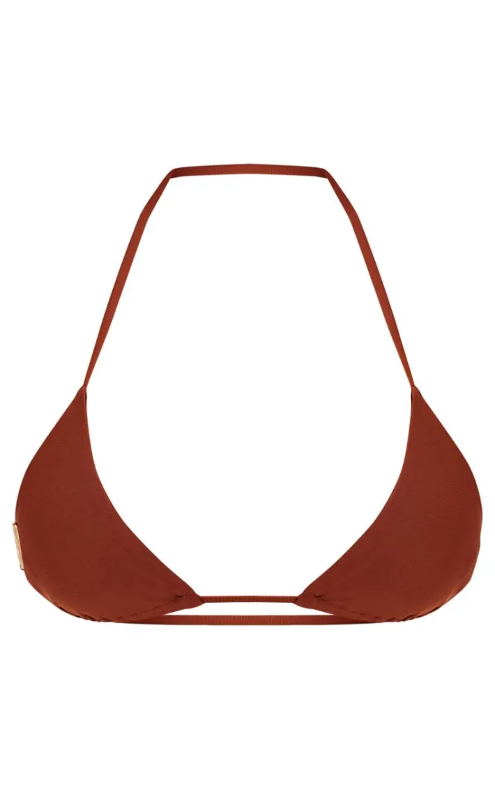 We are loving this bikini top for your new season vacay collection. Featuring a deep brown material with triangle cups and halterneck straps. Complete the look with the matching bikini bottoms for a look we’re obsessed with.
