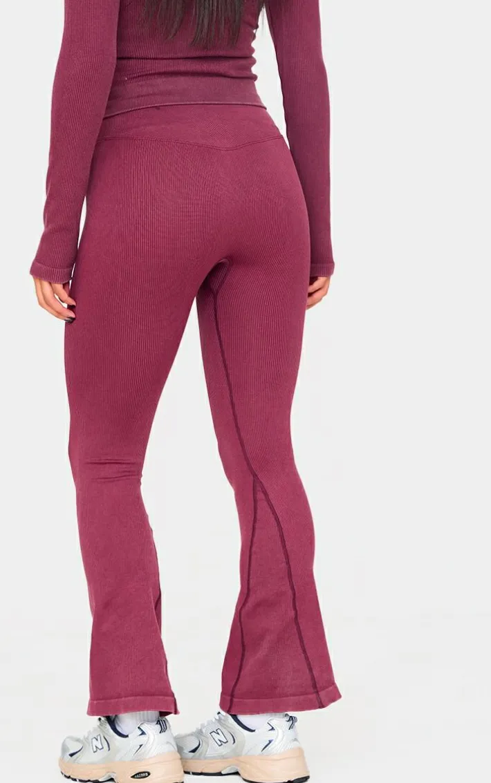 Keep it chic even on those off-duty days with these deep burgundy acid wash seamless rib flare yoga Pants. Brought to you in a deep burgundy acid wash material with a seamless rib design, these yoga Pants are all you need to turn heads. Team with a pair of sneakers and the matching top for a fool proof finish.