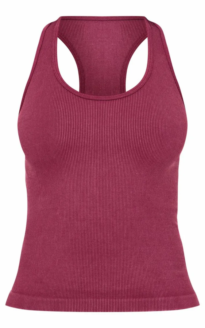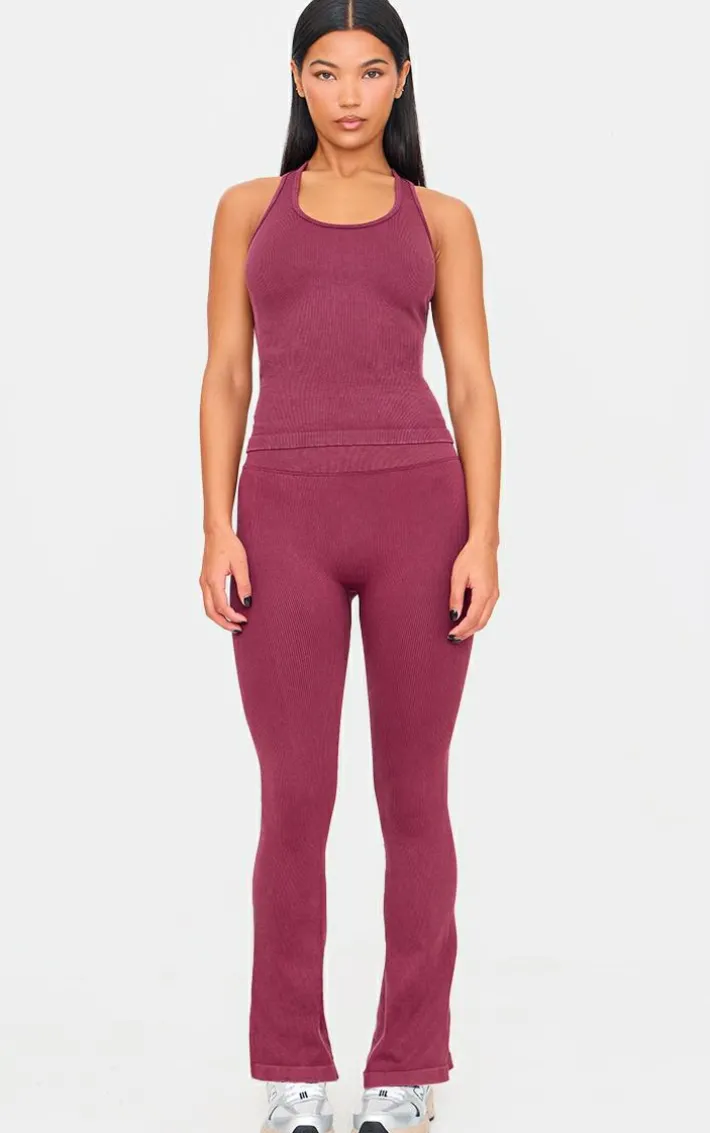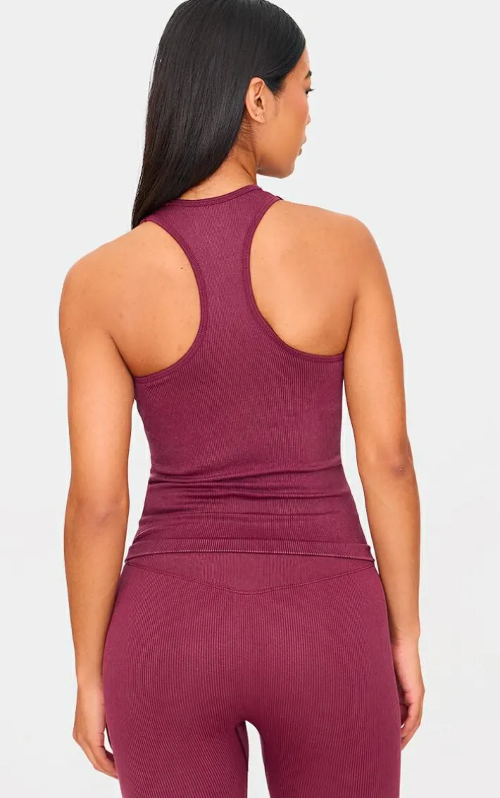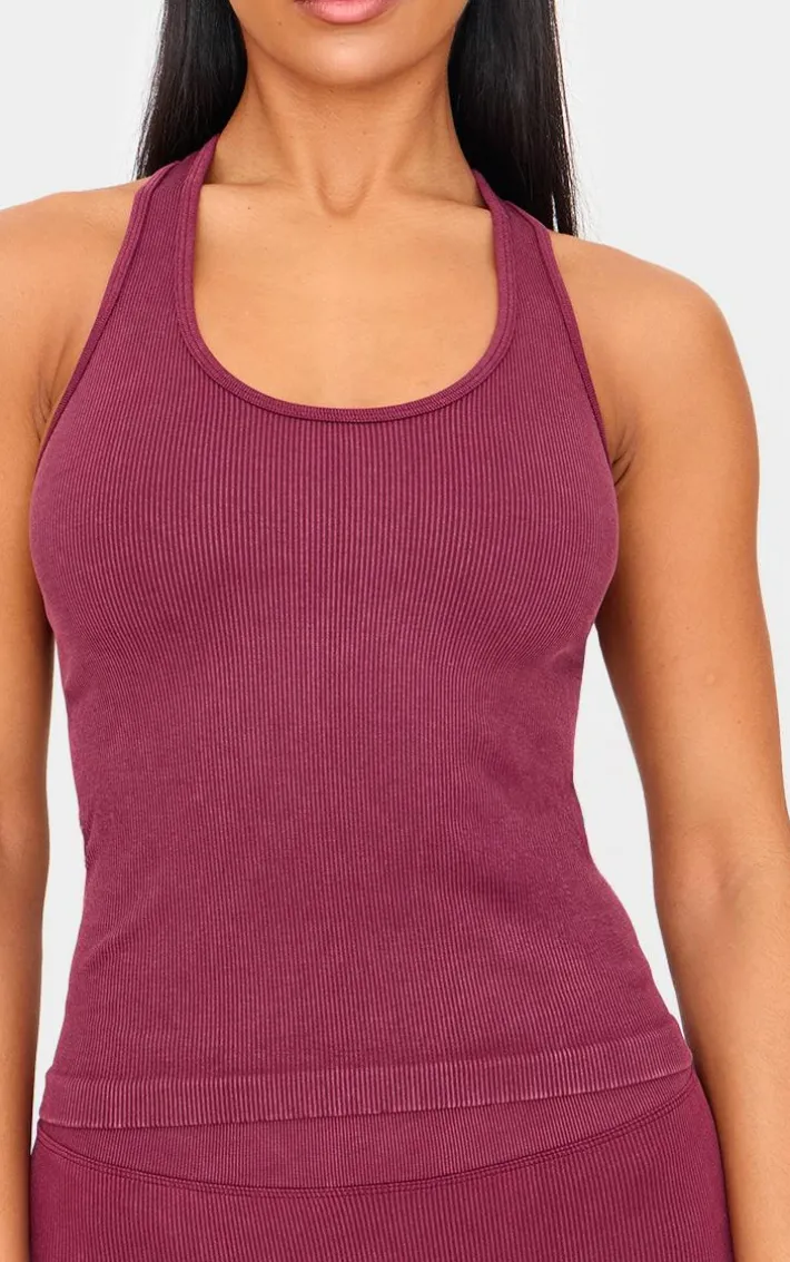 Elevate your gym look with this deep burgundy acid wash seamless rib halter neck gym top. Made from a deep burgundy acid wash seamless rib material with a halter neck design, what’s not to love? Team this gym top with the matching bottoms and sneakers for a look that is perfect for your next workout.