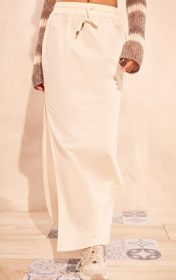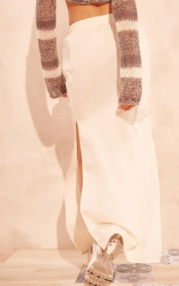 Get ready to nail major trends this season with this ecru cotton poplin split side drawstring waist midaxi skirt, it is the perfect versatile piece to take your look from day to night. Made with an ecru cotton material with a side split detail and a drawstring waist, how could you not be in love? Paor this midaxi skirt with a crop top, chunky sneakers and simple accessories for a flawless finish.