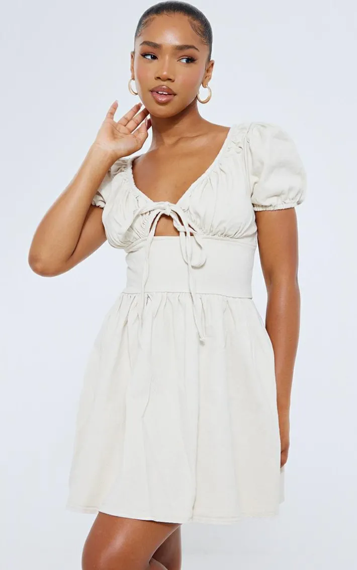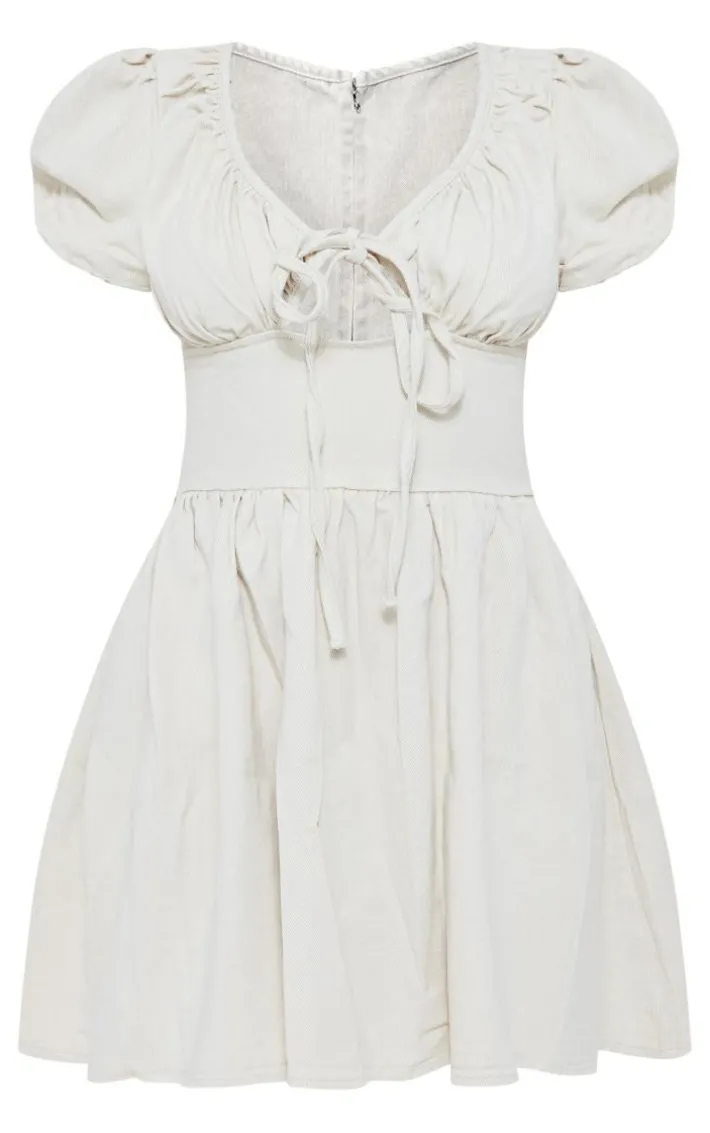 Add a little extra edge to your wardrobe with this ecru puff sleeve fitted waist denim dress. This dress is made from an ecru denim material with a puff sleeve design for an extra touch of luxe. With a fitted waist, this denim dress is all you need to elevate your look. Team with some sandals and your fave accessories to finish off your outfit.