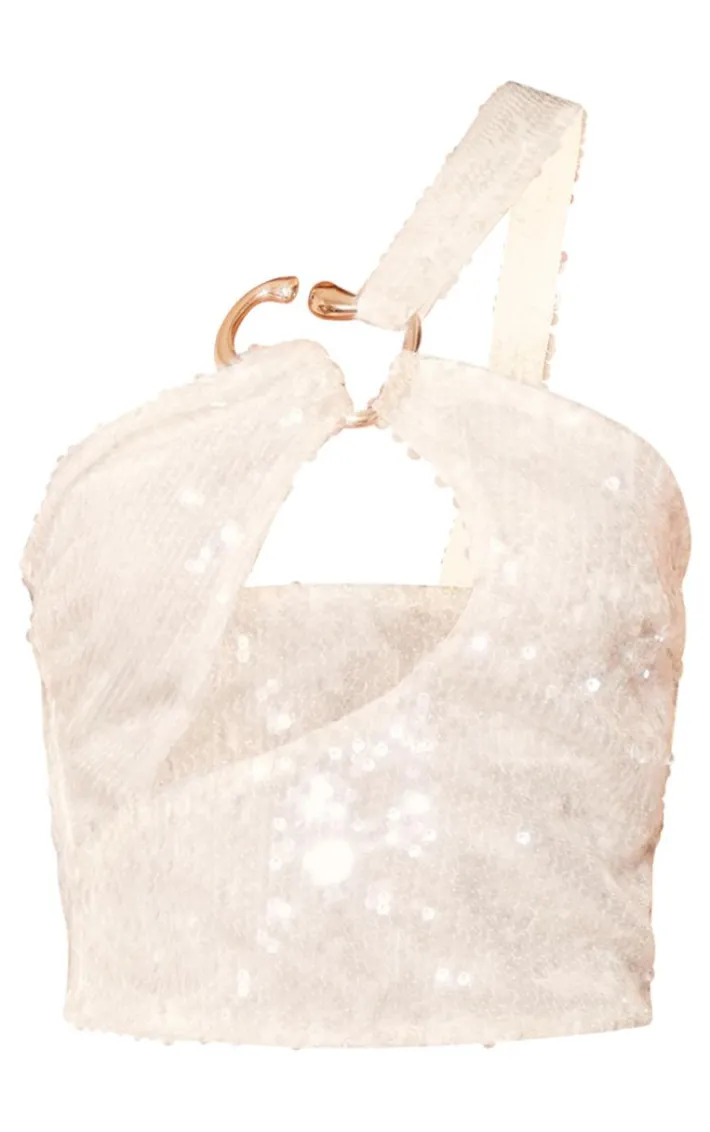 Instantly elevate your weekend look with this ecru sequin cut out metal trim asymmetric crop top. Brought to you in an ecru sequin material with a cut out design, metal trim detailing and a cropped fit, you really can’t go wrong. Style this crop top with the matching skirt, heels and statement gold accessories for a look that is guaranteed to steal all the stares.