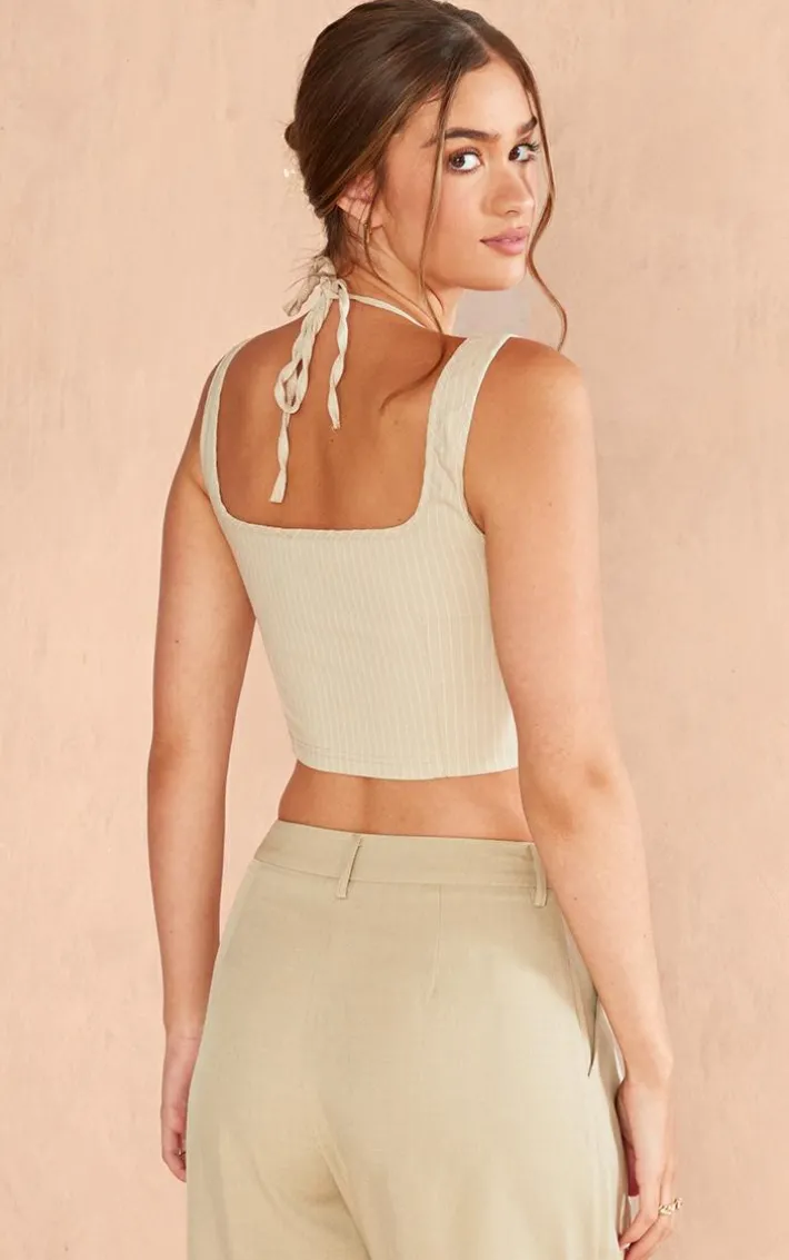 Look effortlessly chic in this ecru tailored pinstripe strappy cutout crop top. Brought to you in an ecru pinstripe material with a tailored fit, cutout design and strappy shoulder, what’s not to love? Style this crop top with tailored bottoms, sandals and accessories for a look we just can’t get enough of.