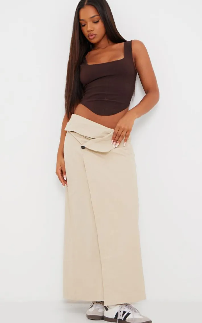 Get ready to earn some serious style points in this ecru tailored twill asymmetric fold over maxi skirt. Brought to you in an ecru hue twill material with an asymmetric fold over design, a chic tailored fit and a maxi length, what more could you want? Style this maxi skirt with a crop top, boots and gold accessories for a look that is guaranteed to have all eyes on you wherever you go.