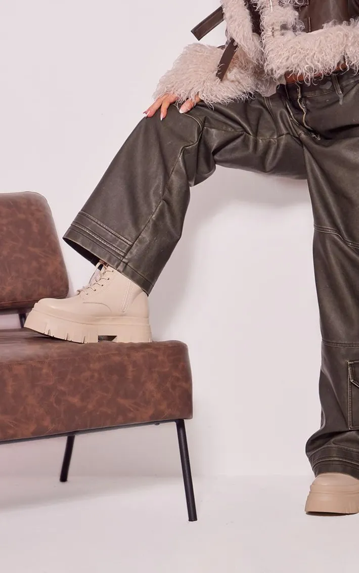 Take your outfit of the day to a whole new level with these ecru wide fit PU leather chunky platform lace-up ankle boots. Brought to you in a ecru PU material with a chunky platform design and lace-up detailing, how could you not be obsessed? These ankle boots are sure to nail the A/W dress code and we know you won’t be able to resist adding it to your basket.
