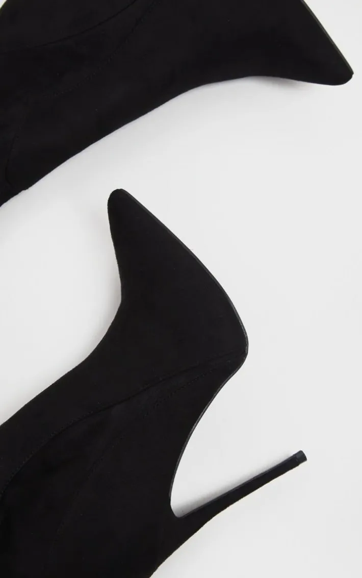 Give any look that fierce finish with these thigh-high heeled boots. Featuring a black faux suede material with a stiletto heel and a thigh-high hugging fit, we are obsessed.