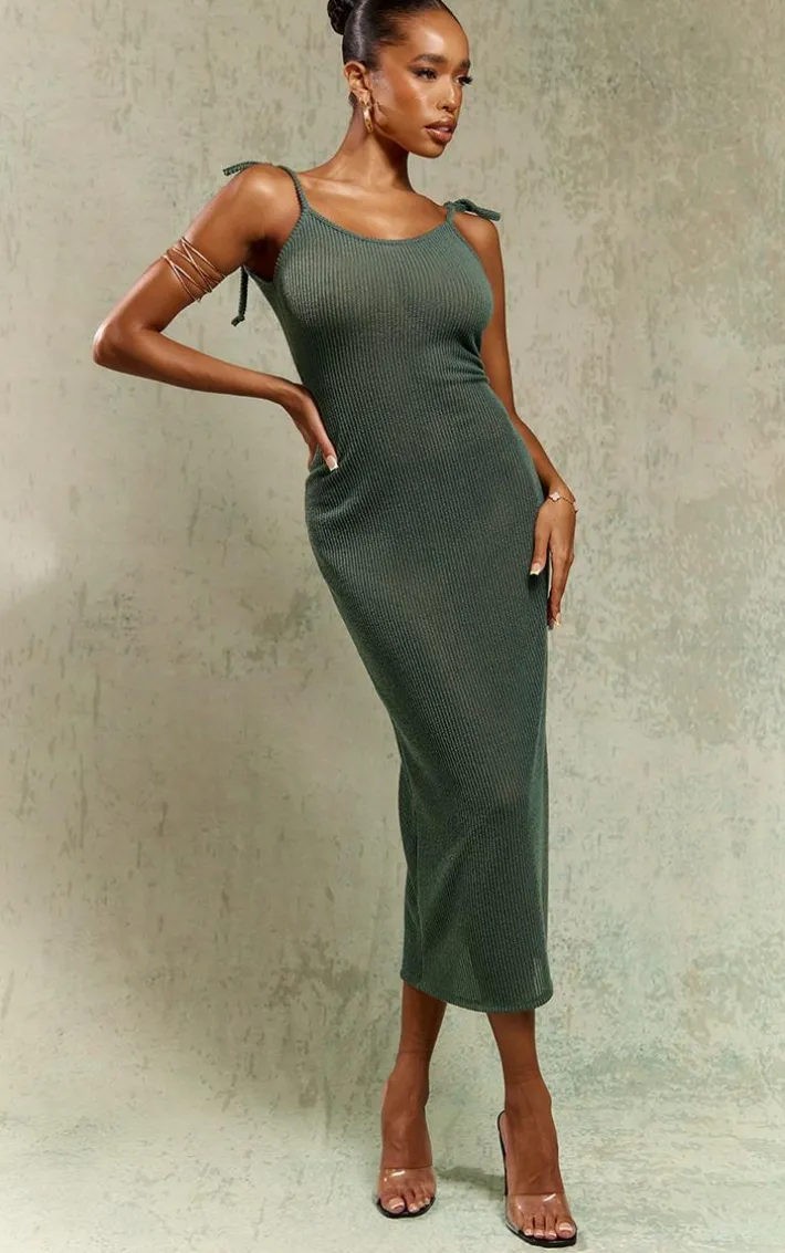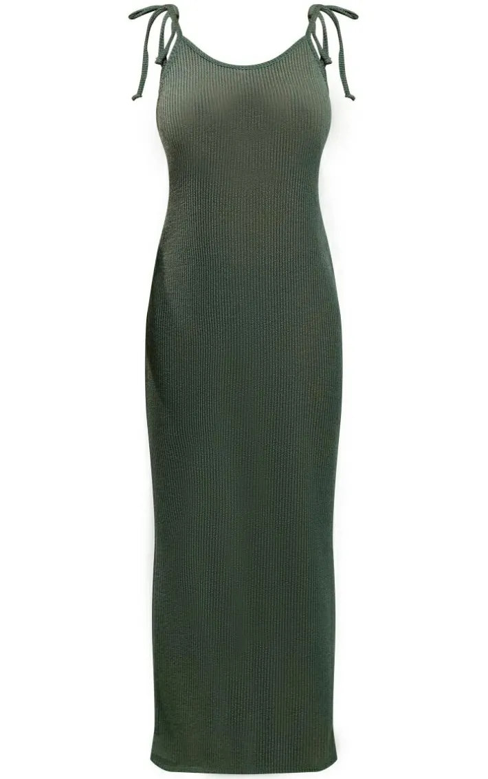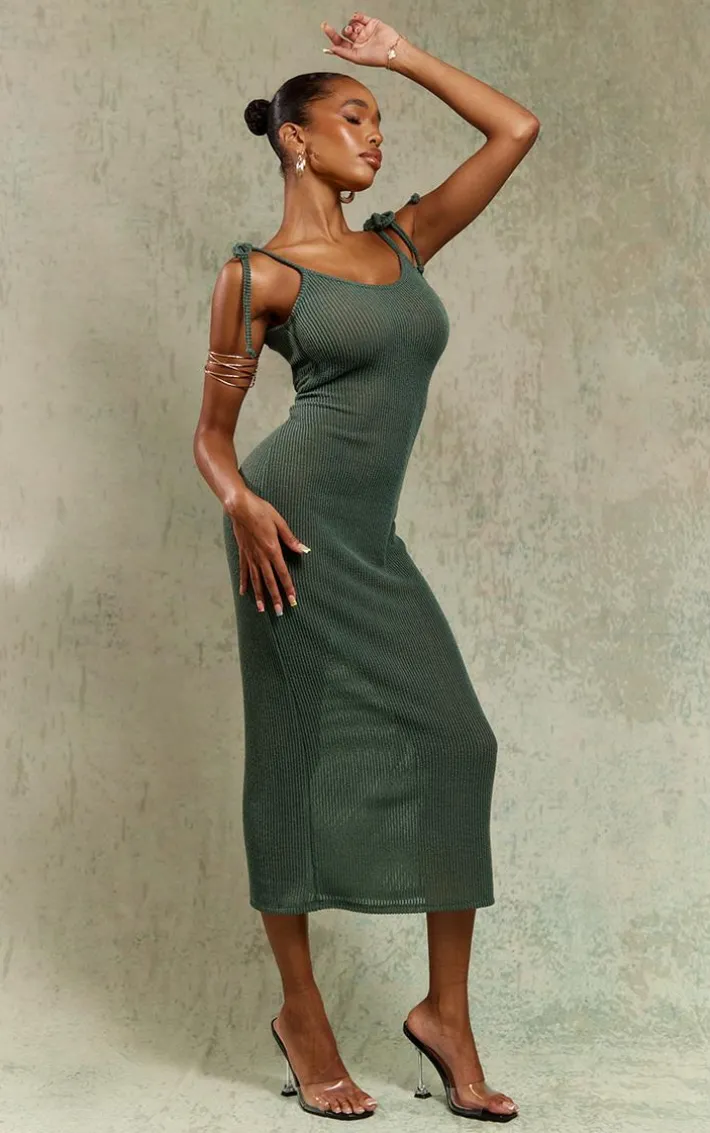 Add some of this seasons on-trend hues into your weekend wardrobe with this forest green textured ribbed tie strappy maxi dress. This maxi dress is made from a forest green textured rib material with a tie strap and a maxi length, this is everything we’re loving and more. With It’s figure-hugging fit this maxi dress is sure to hug you in all the right places. To complete the look style this seamlessly with your dreamy high heels and accessories for a look that will secure you all the likes.