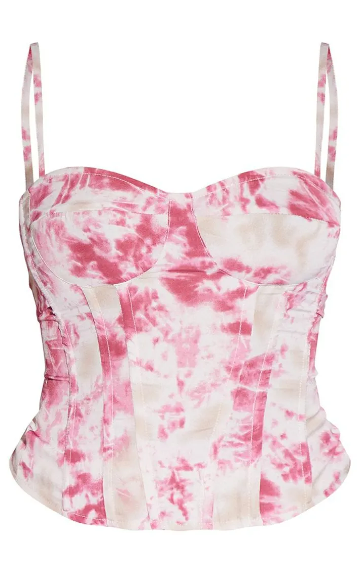 This two piece set top is what dreams are made of doll. Featuring a fuchsia tie dye print material with thin straps and a flattering structured design, wear this with the matching skirt and complete the look with strappy heels.