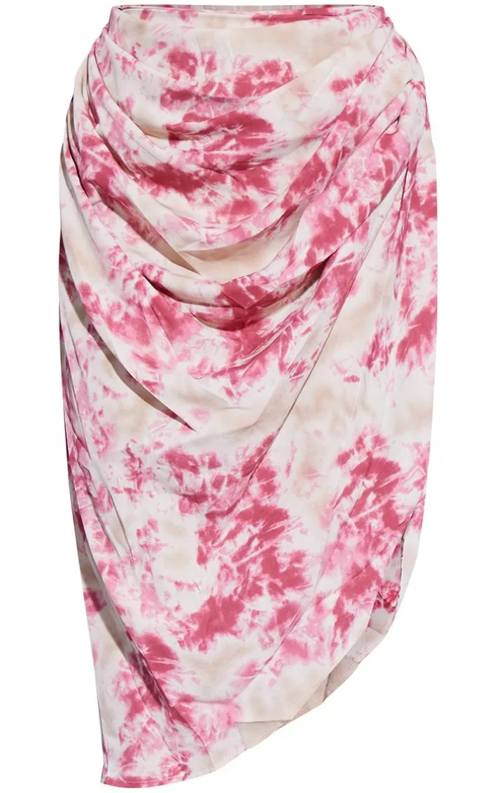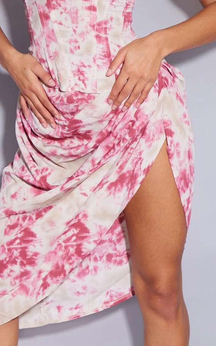 Steal all of the stares in this dreamy two piece set skirt. Featuring a fuchsia tie dye material with a ruched side and midi length, wear with the matching corset top and complete the look with high heels and statement accessories.