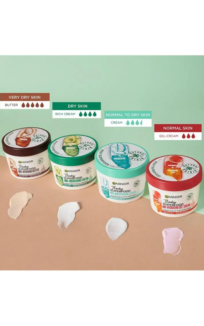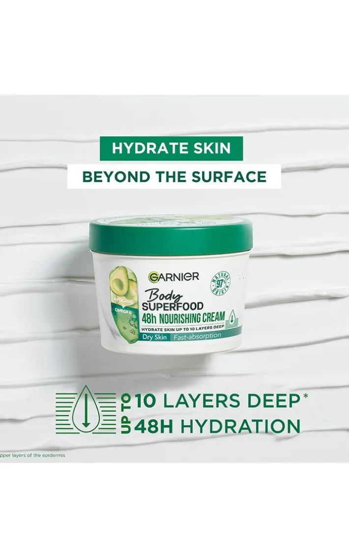 Garnier Body Superfood Avocado & Omega 6 is formulated for dry skin and enriched with two powerful key ingredients! Avocado is known for its powerful nourishing properties & Omega 6 is a fatty acid praised for its lipidic-barrier strengthening properties.This powerful cream leaves the skin feeling instantly hydrated, up to 10 layers deep*, for results you can feel and provides up to 48-hour nourishment**.With ingredients of 97% Natural Origin – this product is a vegan formula.All Garnier products globally are officially approved by Cruelty-Free International under the Leaping Bunny Programme, the leading organisation working to end animal testing worldwide, and the recognised Cruelty-Free Gold Standard.
