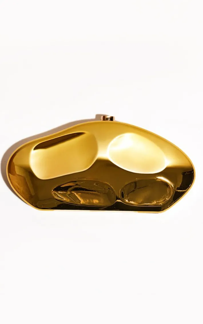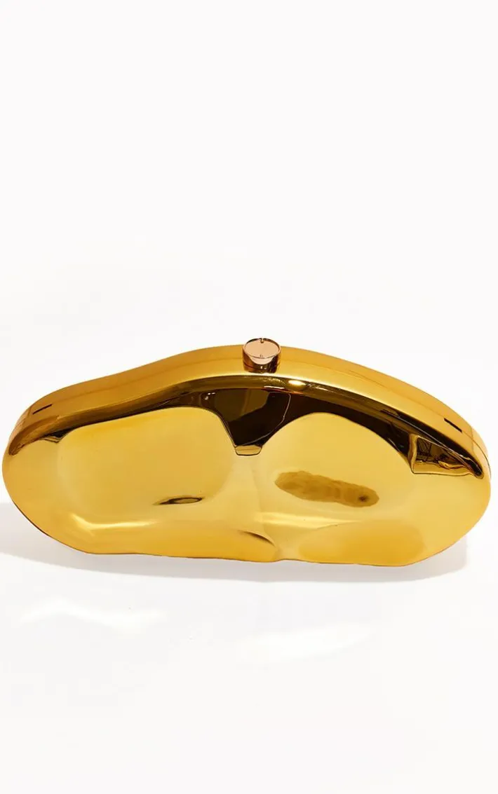 Add a touch of luxe to your weekend wardrobe with this gold abstract oval hard clutch bag. Brought to you in a gold material in an abstract oval shape, this hard clutch bag is a need for your accessories staples. Style with a statement fit for a glam finish.