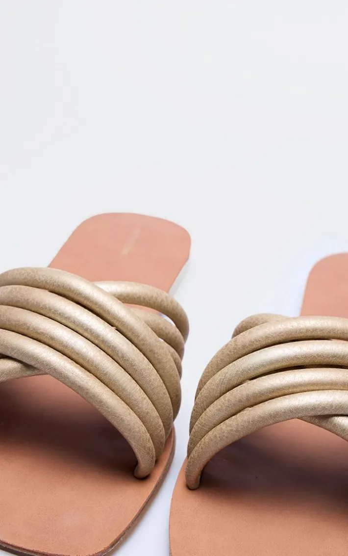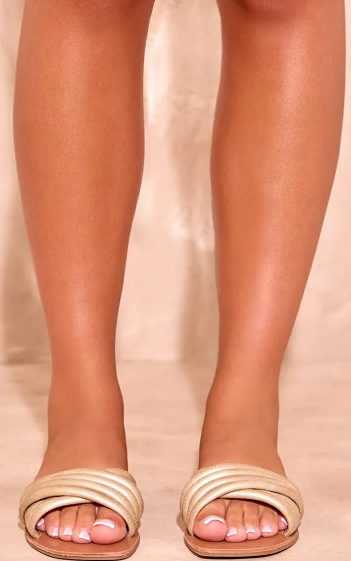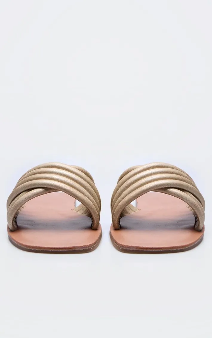 Keep it chic with these gold brushed metallic padded cross over strap flat sandals. Brought to you in a gold brushed metallic material with a padded cross over strap and a flat fit, these sandals are all you need for those on the go days and beyond. Team with your fave accessories to finish off the look we are obsessing over.