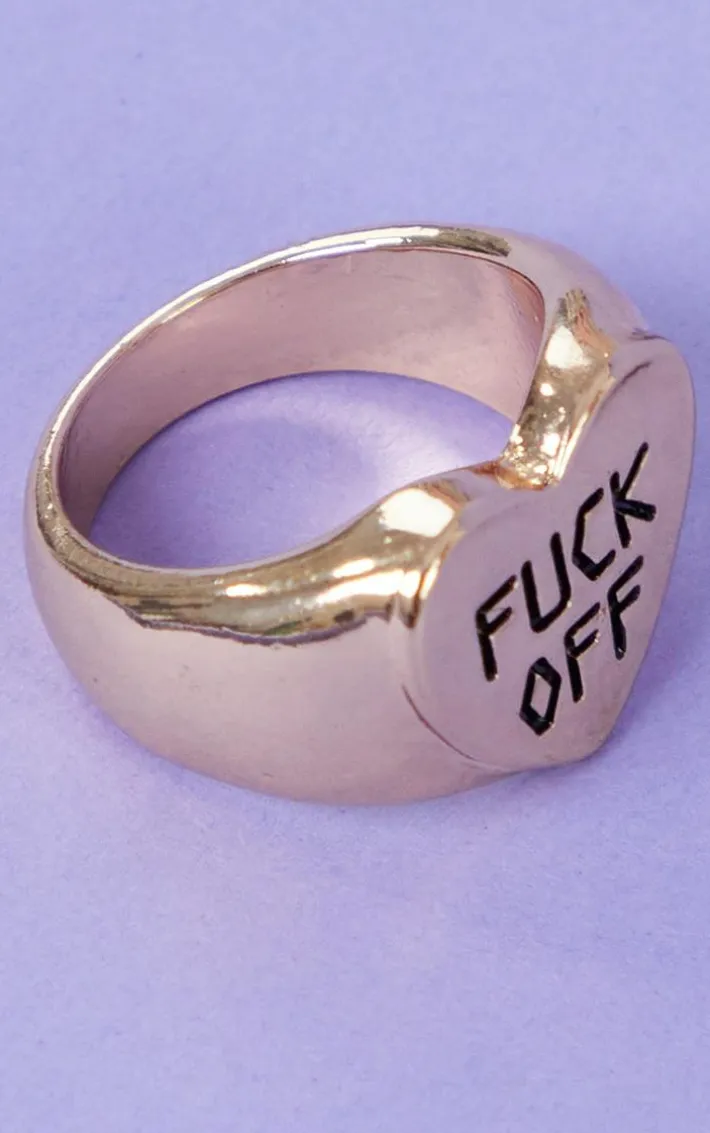 Add a little drama to your look with this ring. Featuring a gold hue with a heart shape and ‘F*ck Off’ engraved detail, we’re obsessed.