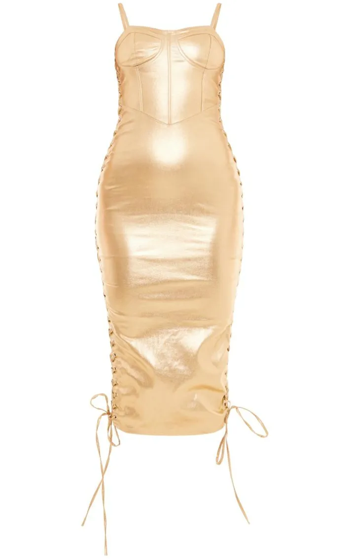 Dare to stand out from the crowd with this gold metallic corset detail lace side midi dress, you won’t be able to resist. This midi dress features a gold metallic material with a lace side design and a figure-worshipping corset style. Pair this metallic dress with clear slip-on heels and your fave accessories for a look no one will forget.