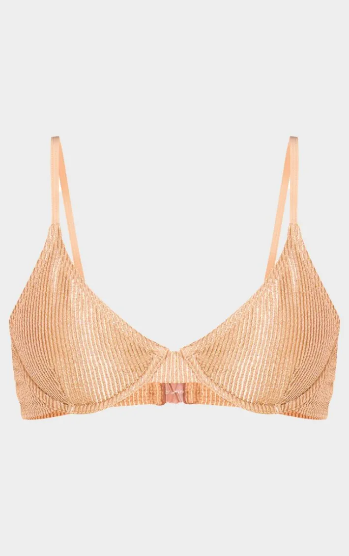 Get ready for the ultimate glow up with this gold metallic crinkle underwired bikini top. Whether you’re lounging by the pool with your besties or off to a beach club, its underwired fit, gold crinkle fabric and adjustable straps will have you looking effortlessly glam. Team with the matching bikini bottoms and your fave pair of sunnies to keep your style game strong.