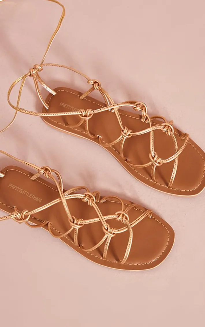 Add some statement hues to your outfit of the day with these gold metallic real leather square toe knotted strap tie up sandals. Brought to you in a gold metallic real leather material with a square toe design that is sure to become a versatile piece in your collection. With a knotted strap and a tie up fastening, it’s a definite yes from us. Team with your vacay outfit to have heads turning.