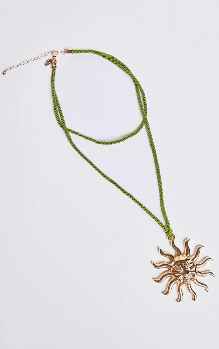 Brighten up your outfit of the day with this gold sun detail khaki rope necklace. Brought to you in a gold hue material with a sun detail and a khaki rope design, this necklace is everything you need and more. Style with a beachy outfit of the day for instant style points.