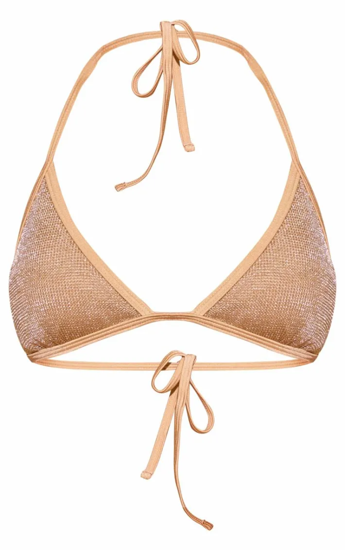 Take your vacay look to a whole new level with this god textured lurex triangle bikini top. Brought to you in a gold textured lurex material with a triangle cup design, how can you say no? Pair this gold bikini top with the matching bikini bottoms and statement gold accessories for a look that is sure to make heads turn wherever you go.