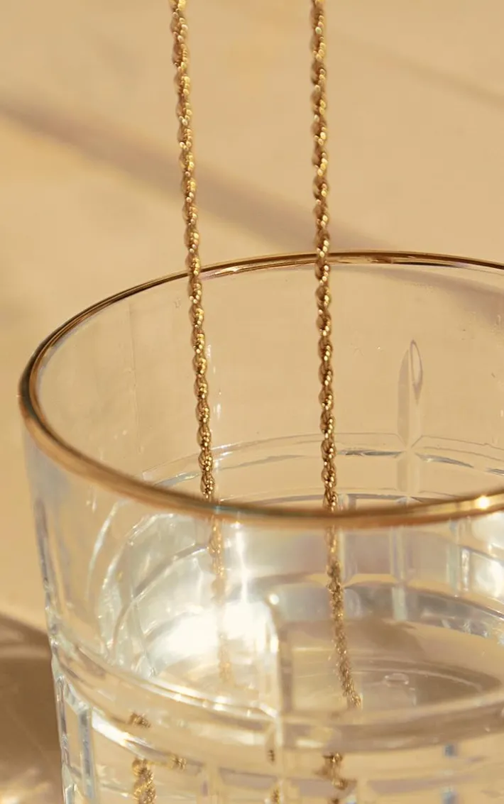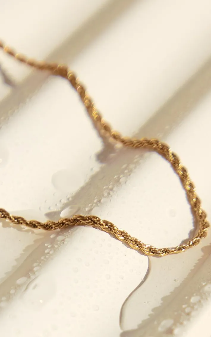Add a little glam to your look with this gold water resistant rope twist necklace. This necklace is made from a gold hue with a water resistant material, perfect for your new season wardrobe. With a rope twist design, what more could you want? Pair this necklace with your fave sunglasses for a combo we just can’t resist.