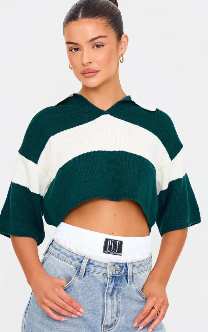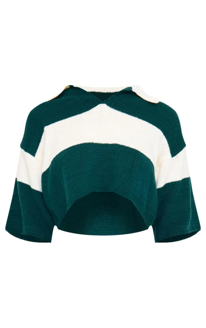 You won’t blend in even on those off-duty days with this green and white stripe knit v neck cropped rugby top. Brought to you in a green and white knit material with a stripe design and a v neck detail this cropped rugby top will bring all the edge to your look. Pair with some high waisted jeans and gold accessories for a look everyone will want.