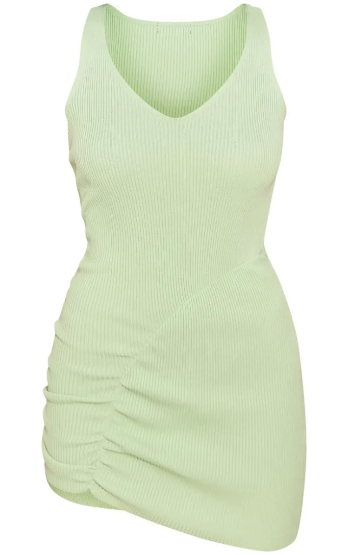 Brighten up your new season wardrobe with this green asymmetric ruched rib knit mini dress. Brought to you in a green hue rib knit material with an asymmetric ruched design and a mini fit, how can you say no? Style this mini dress with flatform sandals and simple gold accessories for a look that is sure to make you stand out from the rest.