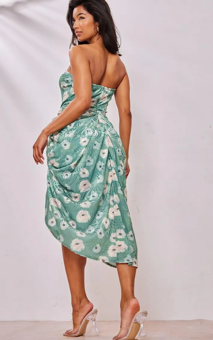 Take your weekend wardrobe to a whole new level with this green floral devore bandeau draped midaxi dress, you’re sure to be showing off your confident side whatever the occasion. This dress features a green floral print material with a draped design and a midaxi length, we’re seriously obsessed. Style this women’s midaxi dress with clear slip-on heels and gold hoop earrings for a combo we’re crushing on for your next date night and beyond.