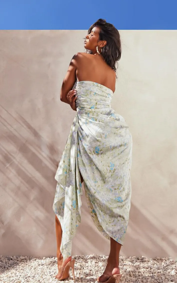 Give your wardrobe that staple summer look with this green floral print satin ruched plunge midaxi dress. This dress is made from a green satin material that will have you feeling on trend this season. Its floral print design and with its plunge detail, this midaxi dress with be showing off your unreal figure, it’s a yes from us. This midaxi dress is perfect for all your plans this summer. Style with some slip-on heels, gold accessories and a shoulder bag for a look that won’t go unnoticed.