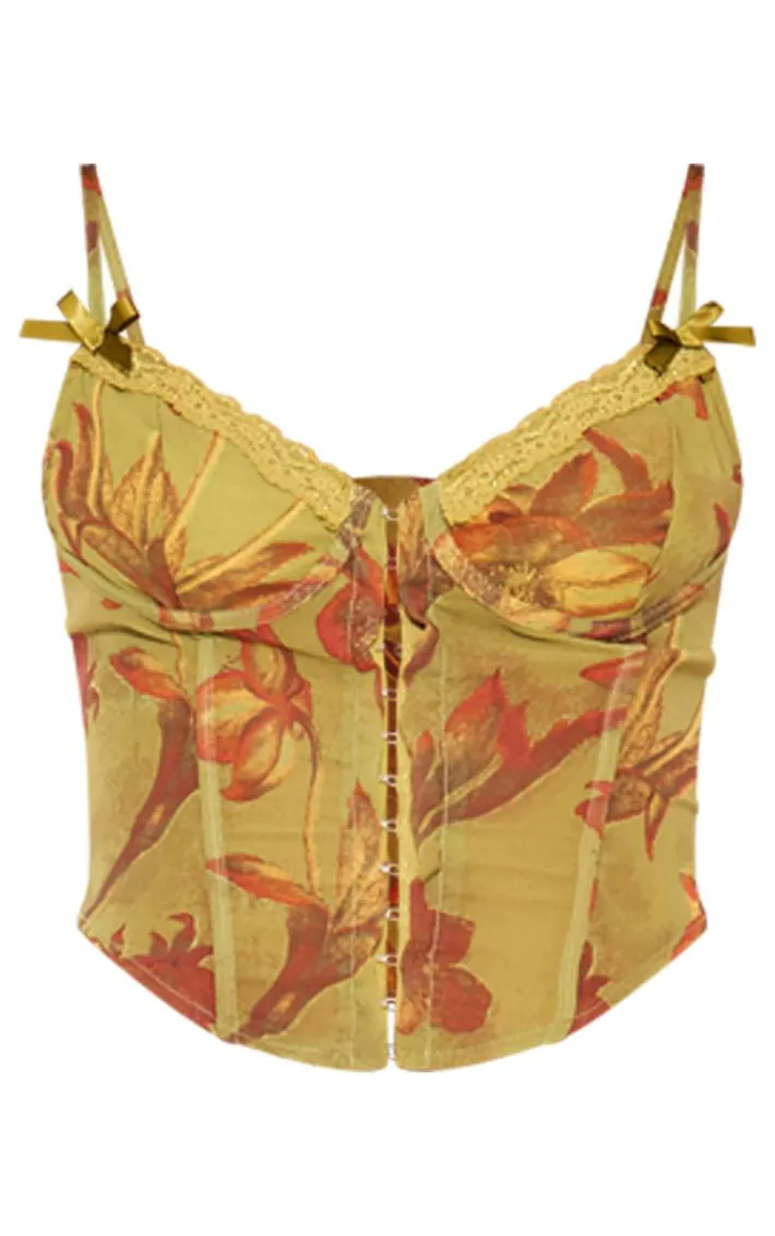 Say hello to your new season staple with this green floral print sheer chiffon bow detail corset. Brought to you in a green sheer material with a floral print design and a chiffon bow detail, what more could you want? This corset will be showing off your shape in all the right places. Style with the matching maxi skirt and some gold hoops for a look that will have heads turning.