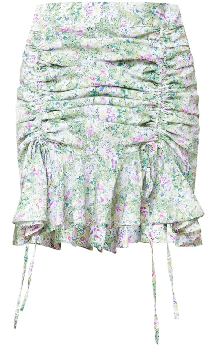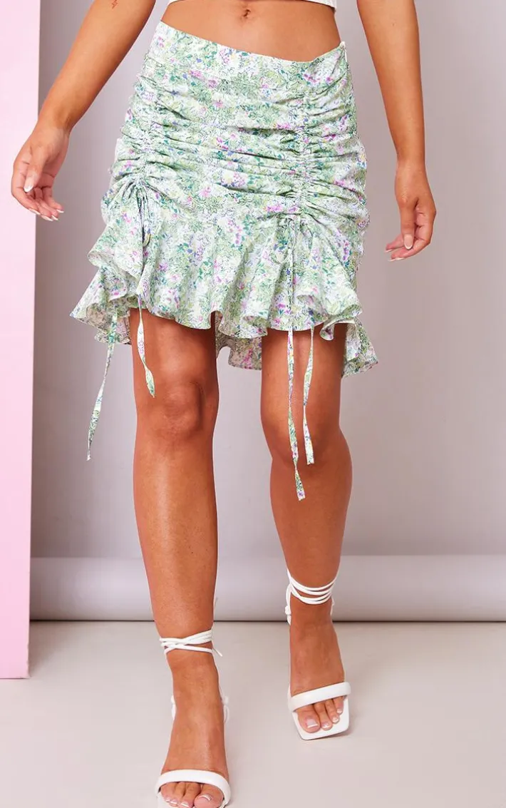 Take any look to new heights with this green floral printed chiffon ruched frill mini skirt. This mini skirt is made from a green chiffon material with a floral print for an effortlessly chic look you wont be able to resist. With a ruched design and a frill detail, this skirt is bringing all the luxe vibes to your wardrobe. Team with some strappy heels and a white tee to complete the look everyone is talking about.