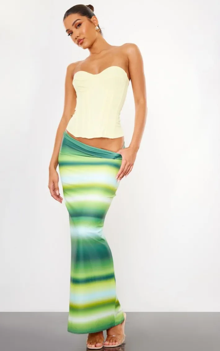 Take your weekend look to new heights with this green ombre printed matte sculpt tie waist maxi skirt. Brought to you in a green hue matte sculpt material with a dreamy ombre print design, tie waist detailing and a flattering maxi fit, how can you resist? Style this maxi skirt with a corset top and clear strap heels for a look that is sure to make heads turn wherever you go.
