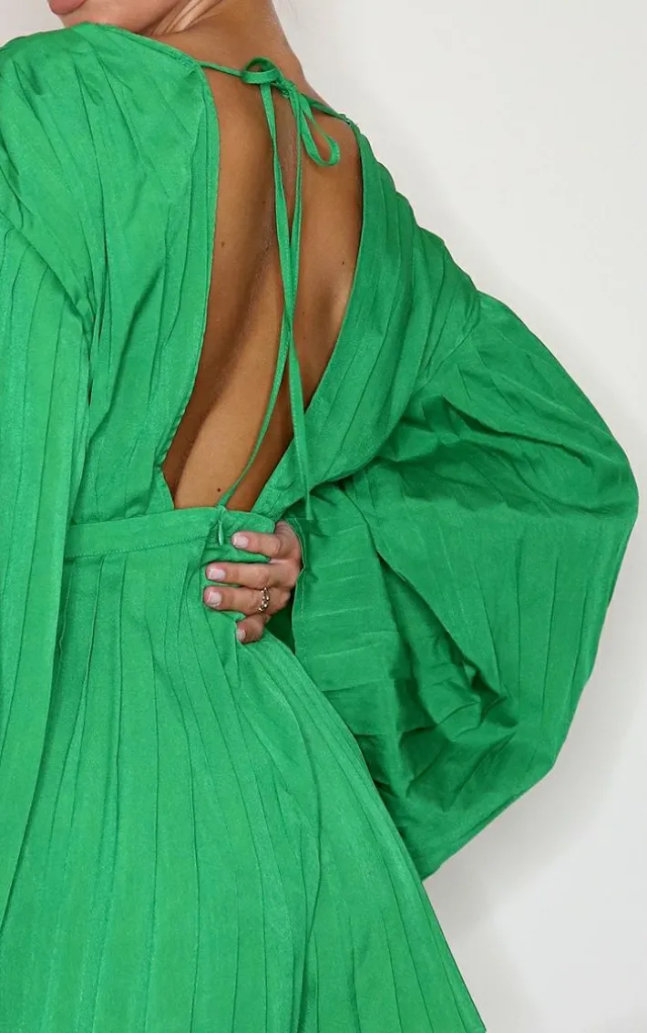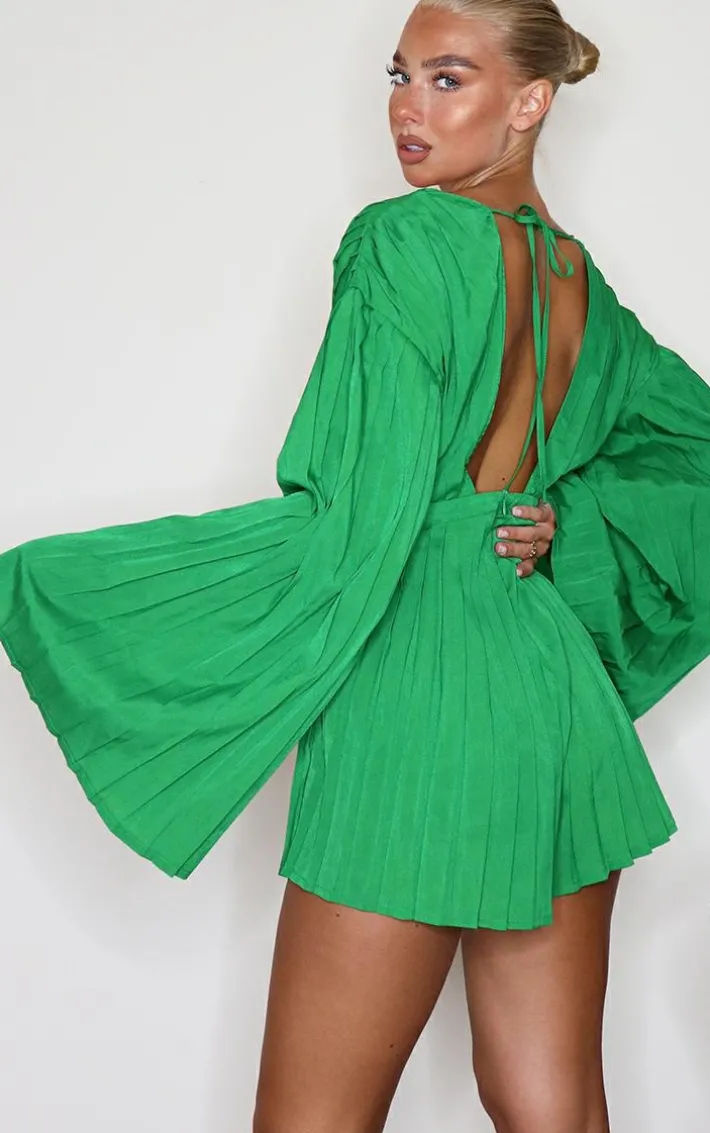Inject some bright colours into your collection with this romper. Featuring a green satin material with pleated detail, a plunging neckline and a wide sleeve design. Team with some strappy mules for the perfect weekend combo.